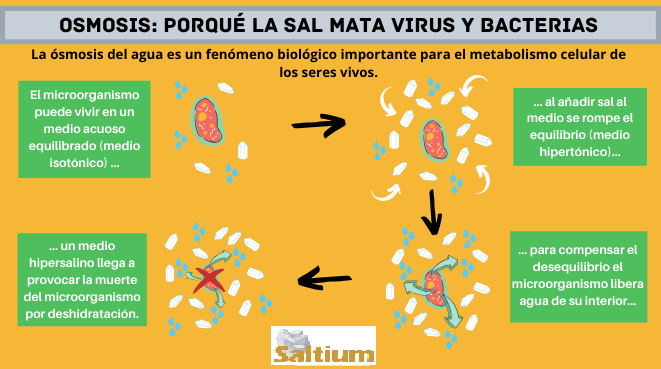 Es decir, los ambientes hipersalinos tienen un riesgo mínimo de transmisión del COVID-19. «La sal provoca un desequilibrio en el entorno celular que hace que, por osmosis, los elementos patógenos acaben inactivados por deshidratación», explican desde Saltium, Claudia Arango, experta en haloterapia y directora del centro Saltium Madrid.