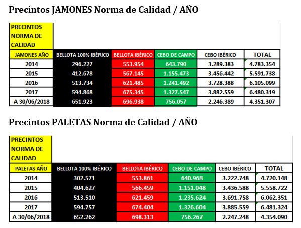 Durante 2017 se identificaron con precintos de Norma 6,48 millones de Jamones y prácticamente la misma cantidad de Paletas ibéricas en nuestro país que, solo en 2017, consumió casi 14.730,21 toneladas de Jamones y Paletas ibéricas por valor de más de 430 millones euros, según datos del Ministerios de Agricultura, Pesca y Alimentación. La internacionalización es una de las prioridades del sector, con crecientes exportaciones a la UE, México, EEUU y sudeste asiático.