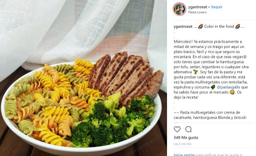 Hamburguesa Blonda con pasta multivegetales con crema de cacahuete y brócoli. Fuente: www.instagram.com/ygastroeat