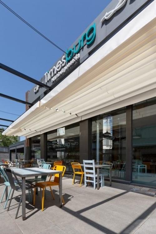 Timesburg, una de las cadenas de hamburguesas más reconocidas a nivel nacional, ha apostado por las soluciones de protección solar de Saxun en su local ubicado en pleno centro de Madrid.