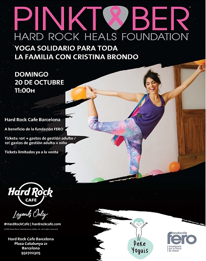 Practicar una actividad física como parte de un estilo de vida saludable reduce el riesgo de padecer cáncer. Para quienes sufren la enfermedad, combinar el tratamiento adecuado con alguna práctica deportiva moderada siempre supone un factor positivo. Hard Rock Cafe Barcelona incluye el deporte en Pinktober 2019, organizando una clase de yoga que tendrá lugar en el Cafe (Plaza Catalunya, 21) el día 20 de Octubre a las 11.00h. para padres y niños protagonizada por Cristina Brondo. La actriz se ha sumado a la causa solidaria sin dudarlo con toda la ilusión de liderar esta preciosa experiencia.
