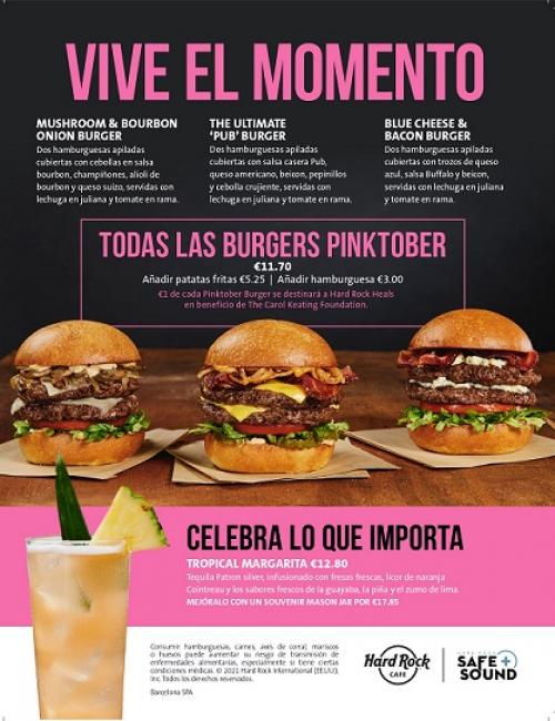 Hard Rock Cafe® Barcelona cuenta con un menú especialmente elaborado bajo la temática rosa como fuente de inspiración, por un tiempo limitado, que incluye: 1 cóctel (Tropical Margarita) y 3 hamburguesas (Mushroom & Bourbon Onion Burger, The Ultimate “Pub” Burger y Blue Cheese & Bacon Burger).