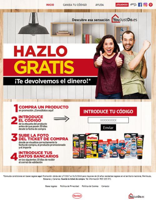 ¡Así de fácil! Entra en la web www.hazlo.youjustdo.es y comprueba las bases del concurso. La campaña “HAZLO GRATIS” se mantendrá vigente hasta marzo de 2018. Por cada compra que realices de uno de los productos adheridos a la promoción, te devolvemos el importe del artículo. Sólo tienes que introducir el código de la etiqueta y subir la foto del ticket de compra. Así, podrás seguir explorando tu lado creativo y convertir tu hogar en un reflejo de tu personalidad. Con Loctite y Pattex tienes los mejores resultados y ahora además… ¡puedes tenerlos gratis!