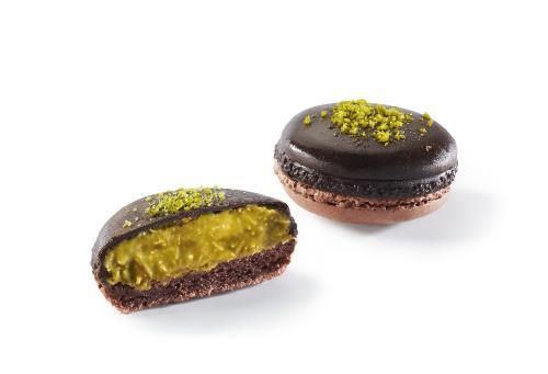 - Base de macaron de cacao intenso: Doble coque de cacao, crujiente por fuera y tierna por dentro
