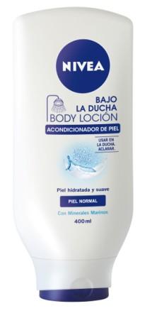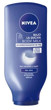 NIVEA BAJO LA DUCHA es un suavizante corporal que utiliza el mismo principio que el acondicionador para el cabello; se aplica con facilidad sobre la piel mojada tras su lavado, dejándose actuar unos segundos y finalizando con el aclarado y secado habitual.
