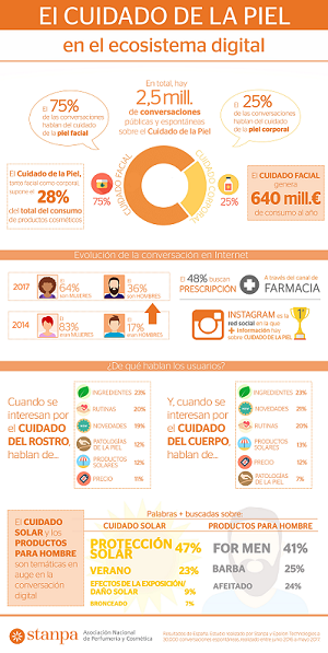 La Asociación Nacional de Perfumería y Cosmética (Stanpa) en colaboración con Epsilon Technologies, ha llevado a cabo la última edición del estudio sobre el Cuidado de la piel en el ecosistema digital. Su objetivo es encontrar patrones y tendencias que siguen los usuarios con respecto a su piel, así como conocer la diversidad de tipologías y el perfil de consumidor que más se interesa por esta materia a través de Internet.