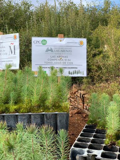 El hotel, que cuenta con el sello de CPC (Carbon Proof Certificate), debe llevar a cabo acciones de reforestación para compensar parte de esa huella de Carbono, siendo su compromiso de 1 tonelada al año. Sin embargo, el equipo ha plantado más de 700 pinos, situándose la compensación en 21,56 toneladas.