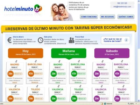 Hotelminuto.com es una herramienta online, innovadora y de última generación, que permite al usuario disfrutar de ofertas de último minuto (para hoy, mañana y pasado), en hoteles de 3 y 4 estrellas, a un precio súper económico que no supera los 45 euros por noche y habitación doble en ciudades como, por ejemplo, Barcelona, Madrid, Sevilla o Valencia.