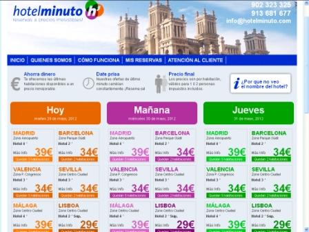 Hotelminuto.com es una herramienta online, innovadora y de última generación, que permite al usuario disfrutar de ofertas de último minuto (para hoy, mañana y pasado), en hoteles de 3 y 4 estrellas, a un precio súper económico que no supera los 45 euros por noche y habitación doble en ciudades como, por ejemplo, Barcelona, Madrid, Sevilla o Valencia.