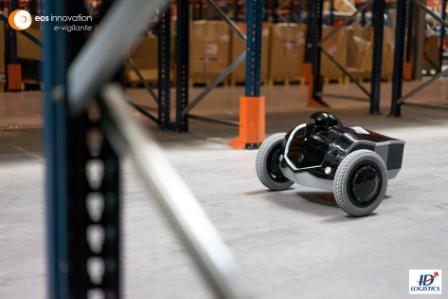 EOS Innovation ha diseñado y desarrollado el robot e-vigilante para mejorar la seguridad interior de los almacenes, zonas industriales y plataformas logísticas. El robot móvil, autónomo y multifuncional se mueve a una velocidad de entre 5 y 10 km/h, puede girar y evitar obstáculos. Cuando detecta un incidente, el e-vigilante, alerta al operador que está en el centro de control remoto, al que envía un vídeo en tiempo real sobre su posición y el incidente que ha ocurrido ese lugar. Después, el operador puede, tomar el control de forma remota, eliminar cualquier inseguridad, categorizar el nivel de alerta y tomar las medidas oportunas, estando siempre fuera de cualquier peligro.