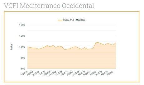 En relación a los fletes con el Mediterráneo Occidental, durante el mes de agosto se registra un crecimiento del 4,3%, con lo que el subíndice se sitúa en un valor de 1.077,23 puntos y continúa con el comportamiento irregular que viene registrando durante todo el 2020. En términos de tráfico, y tras las importantes caídas registradas entre los meses de marzo y abril, la recuperación de la zona es reseñable y el nivel de tráfico es superior al de julio de 2019, destacando especialmente el caso de Marruecos.