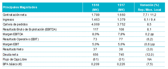 La ratio Book-to-bill de contratación sobre ventas descendió a 1,25 veces frente a 1,39 veces en el primer semestre de 2017.