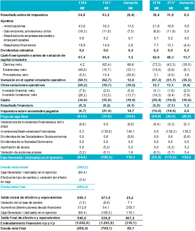 La deuda neta se elevó hasta los 656 millones de euros en el primer semestre de 2018 frente a 588 millones de euros en diciembre de 2017. El nivel de apalancamiento se situó en 2,4 veces el EBITDA de los últimos doce meses (o en 1,5 veces si se excluyera la salida de caja por los pagos de las adquisiciones realizadas en 2017).