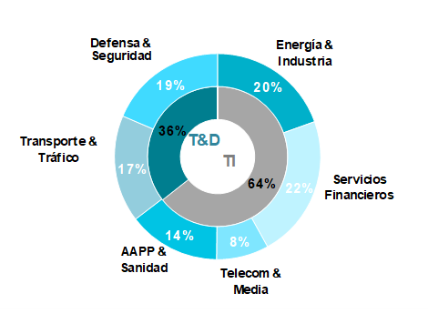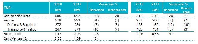 Los ingresos en el primer semestre de 2018 del negocio de T&D descendieron un 5% en moneda local (un 6% en términos reportados) como consecuencia de la caída tanto en el vertical de Transporte y Tráfico (descenso del 7% en moneda local; del 10% en términos reportados), afectado por el segmento de Transportes, como en Defensa y Seguridad (descenso del 3% en moneda local y en términos reportados), por el descenso de la actividad del Eurofighter.