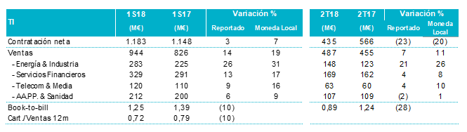 Las ventas en el primer semestre de 2018 del negocio de TI crecieron un 19% en moneda local y un 14% en términos reportados, como consecuencia principalmente de la aportación inorgánica de las adquisiciones y las positivas dinámicas del vertical de Energía e Industria (especialmente en Oil & Gas y en Hoteles). Todos los verticales presentaron tasas de crecimiento positivas en moneda local, siendo la mayoría superiores al doble dígito.