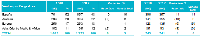 Todas las geografías presentaron crecimientos de sus ventas en el primer semestre de 2018 en moneda local: España (del 16%; 52% de las ventas totales); América (del 6% en moneda local; 20% de las ventas totales); Europa (del 1% en moneda local; 17% de las ventas totales) y AMEA (del 2% en moneda local; 11% de las ventas totales).