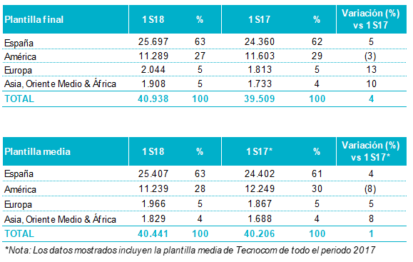 - Los Gastos de Personal aumentaron un 14% en el primer semestre de 2018 hasta los 821 millones de euros, principalmente debido a las adquisiciones (Tecnocom comenzó a consolidar a partir del 18 de abril de 2017, junto con los costes de reestructuración asociados a su integración).