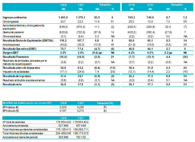 El resultado neto del Grupo se situó en niveles similares a los del año pasado (37 millones de euros en el primer semestre de 2018 frente a 38 millones en el primer semestre de 2017). El beneficio neto por acción básico descendió un 8% en el mismo período. Excluyendo los costes de reestructuración de Tecnocom, el beneficio neto por acción habría crecido un 16%.