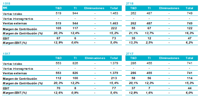 - El Margen EBIT de T&D alcanzó el 12,9%, nivel similar al registrado en el primer semestre de 2017 (del 12,6%).