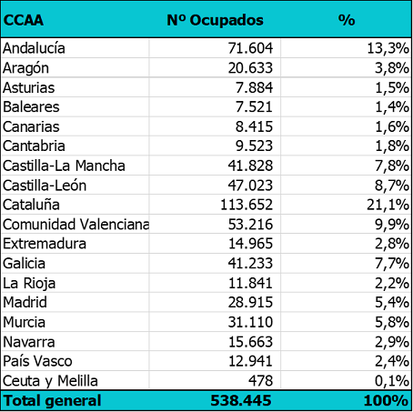 En cuanto a comunidades autónomas, Catalunya emplea al 21% de los profesionales de todo el país, seguida por Andalucía (13,3%), la Comunitat Valenciana (9,9%), Castilla y León (8,7%), Castilla-La Mancha (7,8%) y Galicia (7,7%).
