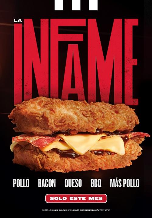Pollo, bacon, queso, salsa bbq y más pollo. Sin pan. Con pollo frito arriba y abajo. La Infame es un producto difícilmente descriptible. Ni es el producto más cotidiano, ni sigue ningún código estético, ni va en la línea de la norma culinaria, ni será moralmente aceptable para muchos. ¿Es una hamburguesa o un cachopo? Son precisamente todos esos los motivos por los que en KFC están convencidos de que es irresistible. Porque es un pecado y, al final, todos terminamos pecando.