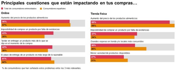 El incremento de los precios de los alimentos y la imposibilidad de comprar algunos productos como consecuencia de la rotura de los stocks son dos de las principales cuestiones que están impactando en la experiencia de compra tanto de los consumidores online como de los que van a los establecimientos físicos (ver gráfico). El aumento de los precios de la alimentación ya representa un problema para el 56% de todos los consumidores digitales encuestados -57% en España-. Y también lo es para el 65% de los compradores que acuden a las tiendas físicas -69% en España-. De hecho, la inflación y los problemas en las cadenas de suministro están empezando a hacer mella en los hábitos de compra de los ciudadanos que están optando, primero, por centrar sus presupuestos a aquellos productos imprescindibles, en detrimento de otros, y, además, por buscar a las marcas y a los retailers de sus mercados locales.