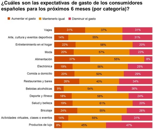 El estudio revela que el 75% del conjunto de los entrevistados esperan mantener o, incluso, aumentar sus niveles de gasto, aunque su distribución será desigual en función del tipo de productos a los que nos refiramos. En los próximos seis meses, la mayor parte seguirá destinándose al segmento de alimentación, según el 47% de los consumidores globales -el 37% de los españoles-. Sin embargo, más de un 25% de los participantes en el informe tienen previsto reducir lo que gastan en un buen número de categorías, como los productos de lujo (37% global/47% en España); los restaurantes (34% global/34% en España); en viajes (33% global/31% en España), en bebidas alcohólicas (3o% global/ 36% en España); en arte, cultura y deportes (30%/31% en España) y en moda (25% global/23% en España). Un comportamiento que, según el informe, podría ser solo un adelanto de lo que está por venir si la coyuntura económica actual, como parece, se mantiene o incluso empeora.