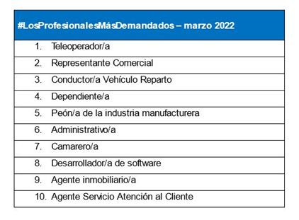 En este mes de marzo, las tres primeras posiciones del ranking de los puestos más demandados las ocupan de nuevo teleoperador/a, representante comercial y conductor/a de vehículo de reparto. Cabe destacar como cada mes la presencia en el ranking de desarrollador/a de software, que ocupa la octava posición; así como la aparición de camarero/a, que se sitúa en séptimo lugar con más de 5.300 vacantes.