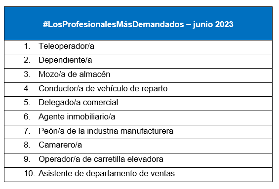 Respecto a los profesionales más demandados en nuestro país, las tres primeras posiciones del ranking de junio las ocupan teleoperador/a, dependiente/a y mozo/a de almacén. Destaca, además, la presencia de agente inmobiliario/a en la sexta posición, con más de 8.300 vacantes, y el descenso de camarero/a hasta el octavo puesto, con más de 6.700 puestos de trabajo ofertados, un 16% menos que en mayo.