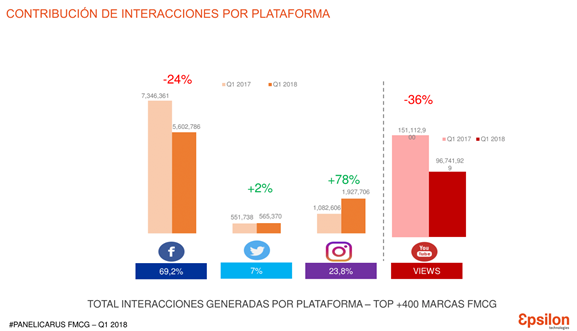 Según se desprende del Panel Icarus de Gran Consumo Q1 2018, a pesar de liderar la generación de interacciones (69%), las marcas están disminuyendo la actividad en Facebook (-18%), lo que está afectando principalmente a las interacciones en esta red (-24%). Se percibe también una leve reducción de actividad en Instagram (-3%) pero con contenido de mayor calidad, lo que ha provocado un destacado aumento de las interacciones en esta plataforma (+78%).