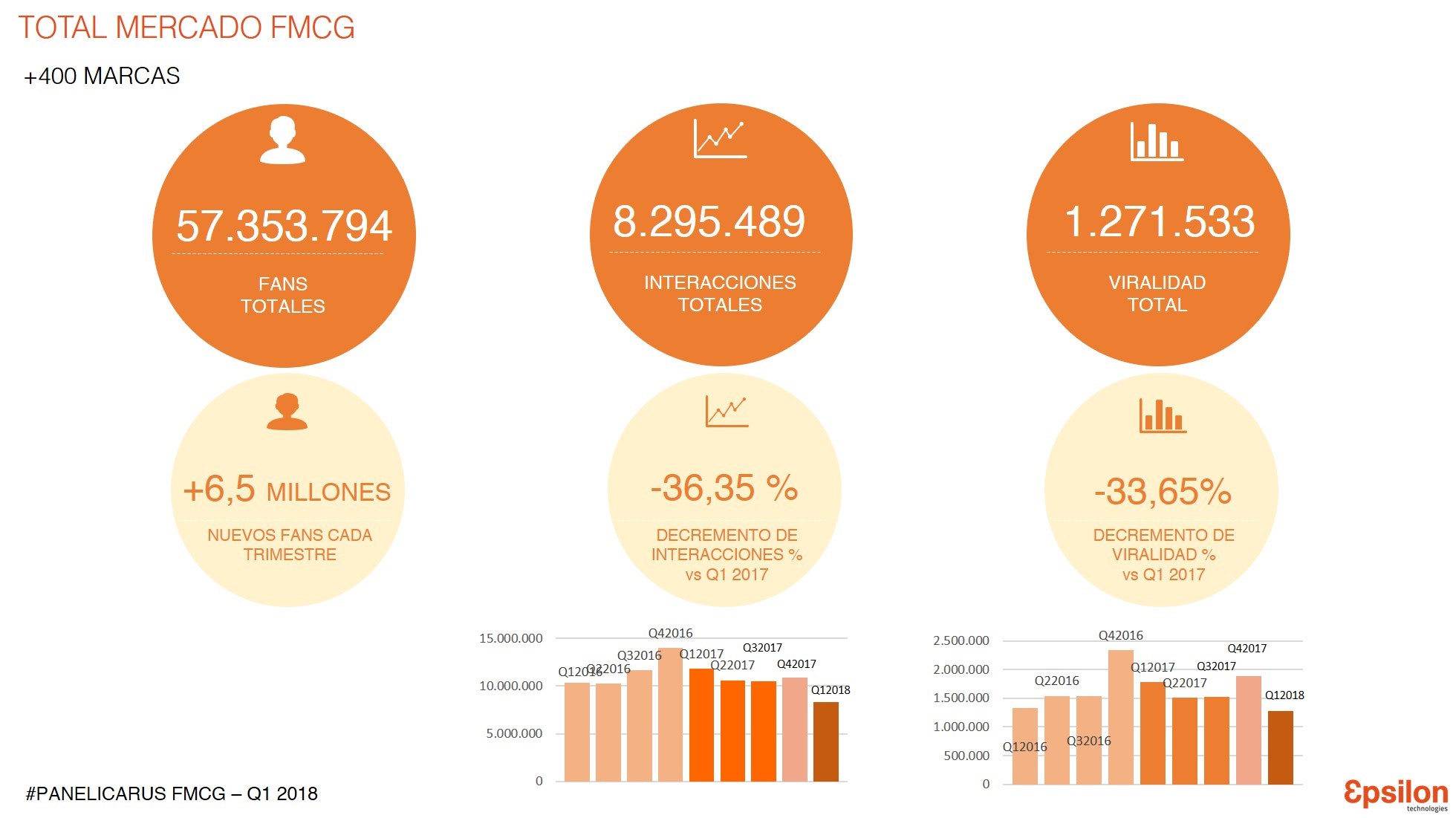 En términos generales, el mercado del Gran Consumo vuelve a demostrar su gran fortaleza en redes sociales el primer trimestre de2018: este mercado ha generado más de 8 millones de interacciones y ya cuenta con más de 57 millones de fans totales. El estudio se ha basado en la actividad en redes sociales (Facebook, Instagram, Twitter y YouTube) de 400 marcas del sector del Gran Consumo (alimentación e higiene). El Panel Icarus Q1 de Gran Consumo se puede descargar aquí: https://epsilontec.clickfunnels.com/webinar-registration.