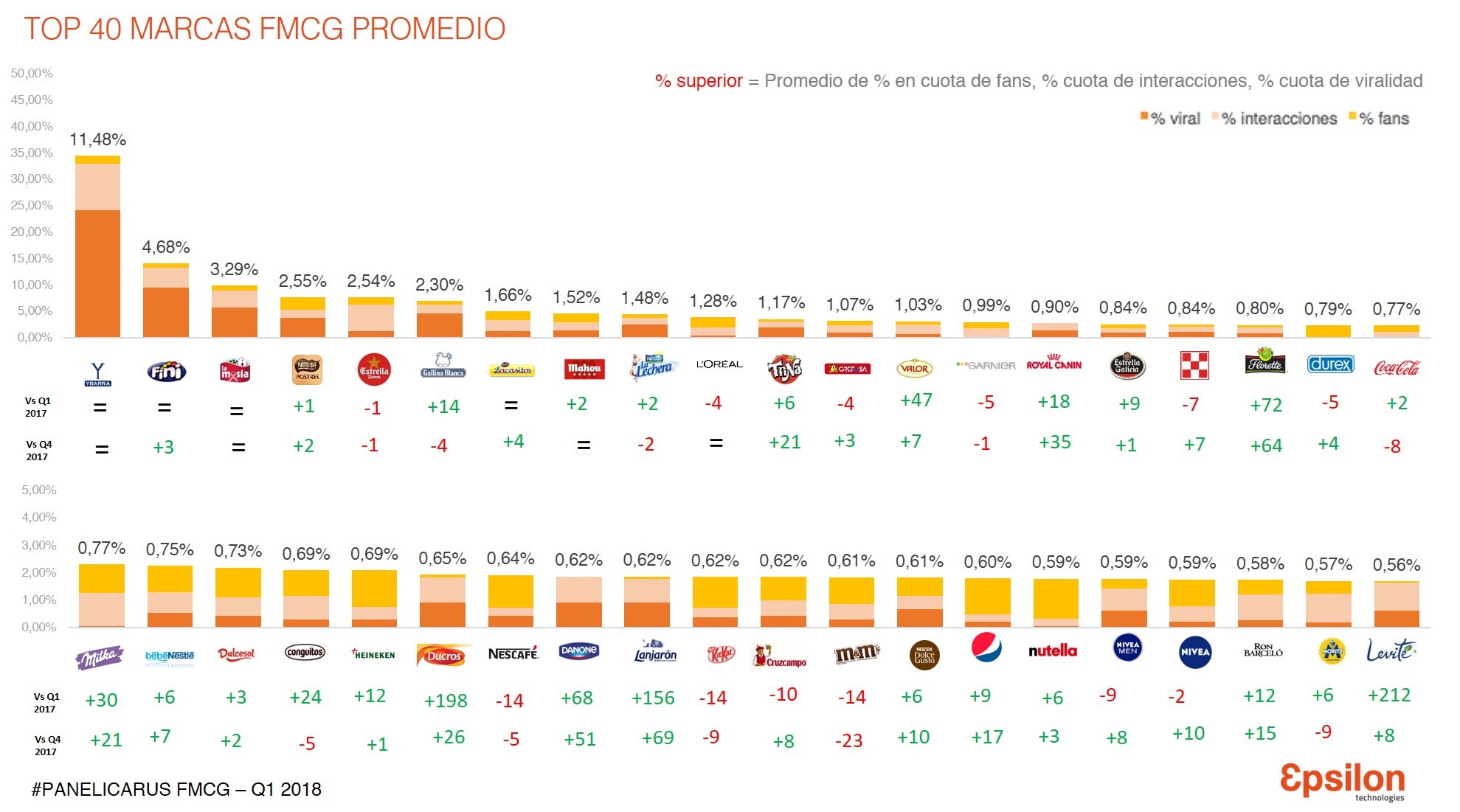 Según el Panel Icarus FMCG correspondiente al primer trimestre de 2018, las 10 marcas de Gran Consumo con mayor impacto en redes sociales en España han sido Ybarra, Fini, La Masía, Nestlé Postres, Estrella Damm, Gallina Blanca, Lacasitos, Mahou, La Lechera y L’Oréal. Destaca la subida de 198 puestos en el ranking de Ducros, Lanjarón (+156), Florette (+72), Valor (+47), Milka (+30), Conguitos (+24),Royal Canin (+18), Estrella Galicia (+9) y Trina (+6), que escalan con mucha fuerza respecto al mismo trimestre del año anterior.