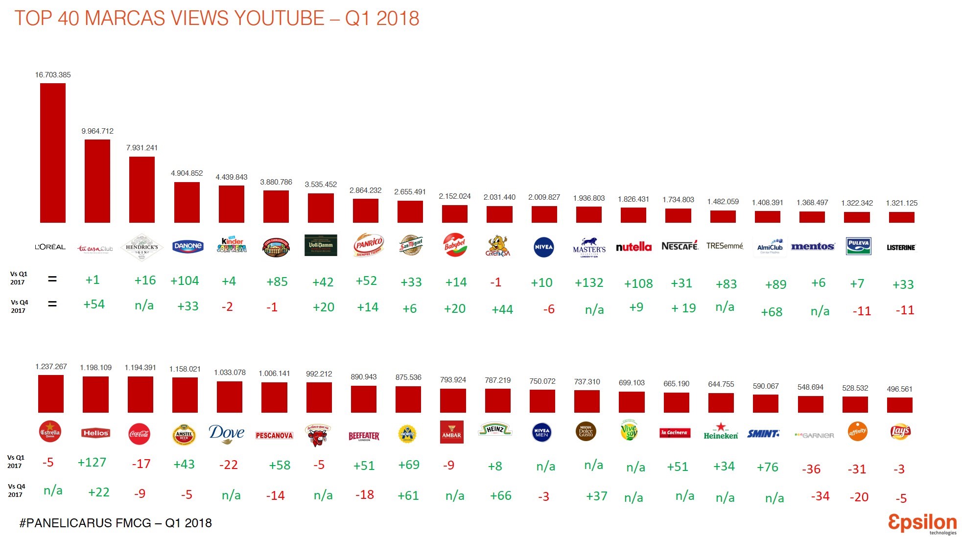 Respecto a las marcas con más views en YouTube en el primer trimestre de 2018, lidera el ranking de forma muy destacada L’Oréal, con más de 16 millones de views, seguida por TuCasaClub, el canal de las marcas de Henkel, con casi 10 millones de views, y Hendrick’s Gin con casi 8 millones de views. Cabe destacar que YouTube es utilizada por las marcas como red social especializada en una temática concreta, con un storytelling muy definido.