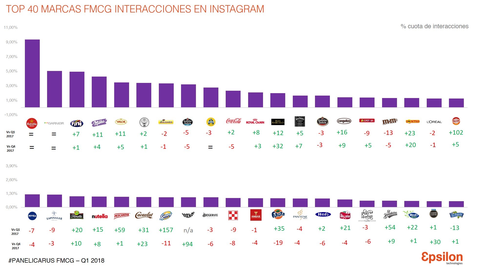 Respecto a las marcas con más interacciones en Instagram en el primer trimestre de 2018, lidera el ranking Estrella Damm, seguida de Garnier, Fini, Milka y Valor. Es precisamente a esta red donde las marcas están enfocando el territorio de influencers, una estrategia de branding que funciona muy bien para llegar al target. Por otra parte, a diferencia de Facebook, en Instagram las marcas se enfocan en generar contenido que genere aspiracionalidad y en gran medida el éxito en este territorio depende de la creatividad de las imágenes.