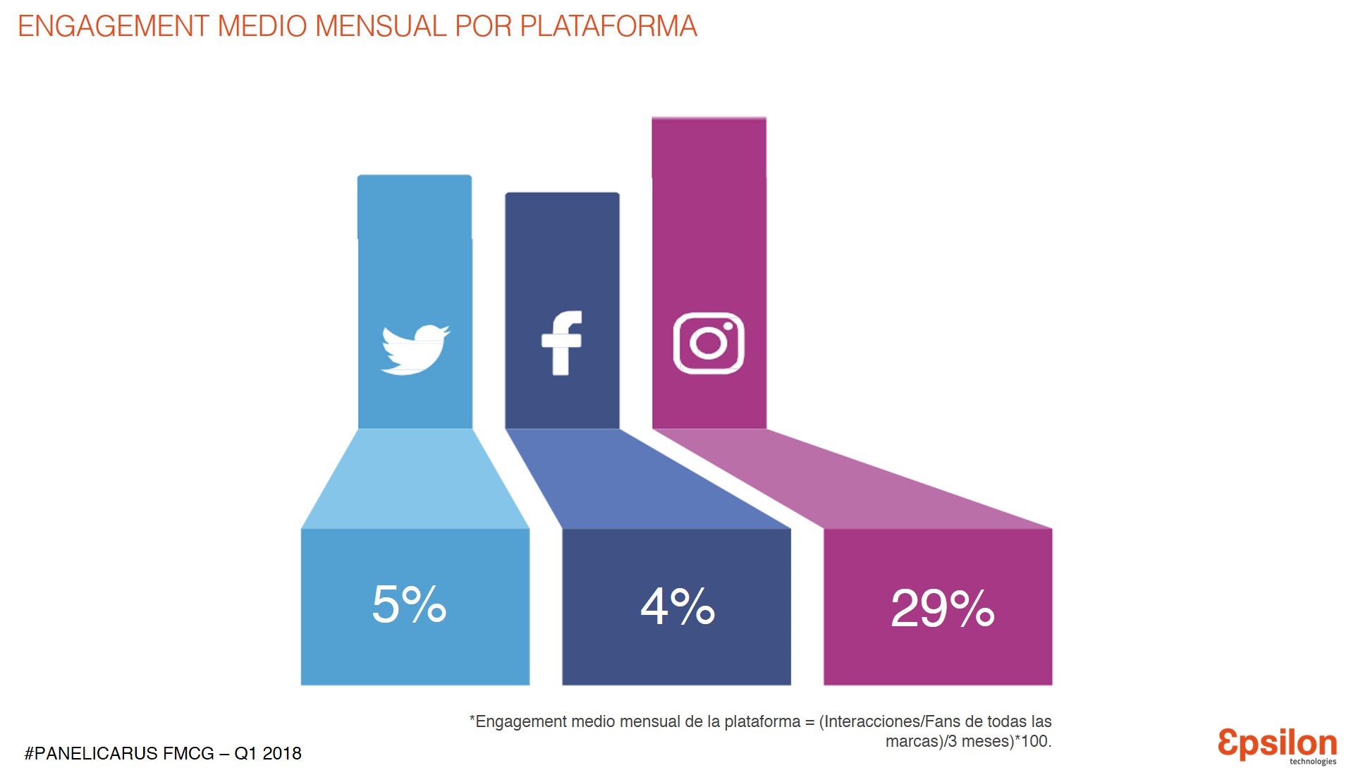 Por plataformas, Instagram lidera la generación de engagement, situándose en un 29%, muy por encima de Facebook (4%) al que incluso supera Twitter, con un 5%. Según estos datos, Instagram es la red más eficiente para el Gran Consumo en España (el engagement medio mensual se calcula de la siguiente forma: ((Interacciones totales/fans totales)/3 meses)*100).