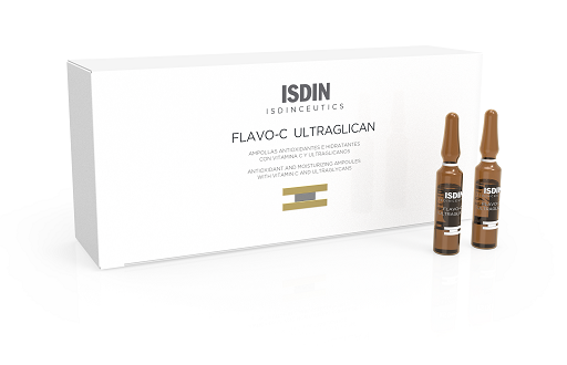 ISDINCEUTICS FLAVO-C ULTRAGLICAN es una avanzada solución facial en ampollas con Vitamina C y Ultraglicanos. Su combinación de antioxidantes e hidratantes actúa en la pérdida de firmeza y sobre las líneas firmes de expresión. Ayuda a recuperar la luminosidad en la piel, facilita la recuperación de la elasticidad y previene los primeros signos de envejecimiento. Su contenido en Ultraglicanos (proteoglicanos + preproteoglicanos) acelera la producción de ácido hilurónico y proporciona una mayor hidratación.