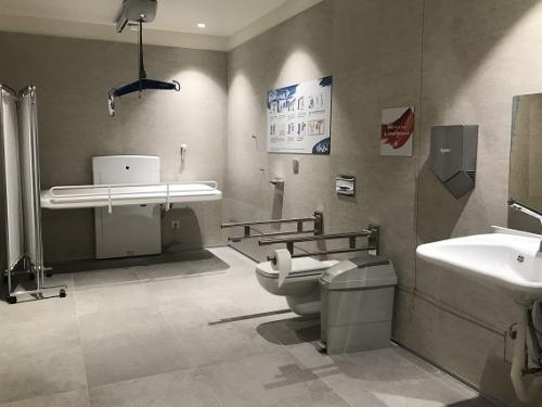 Esta sala mide casi 13 m², dentro de los cuales se incluyen una camilla abatible eléctrica con barandilla de seguridad, un lavabo ergonómico con regulación en altura neumática, un espejo reclinable, una grúa de techo, un biombo, una repisa para bolsas de colostomía, un conjunto de papelera y dispensador de toallitas, una papelera de pañales, un inodoro adaptado con las barras de apoyo abatibles y un sistema de alarma para pedir ayuda en caso de caída.
