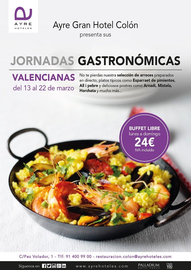 Valencia es la tierra de las flores, de la luz y del amor… y en fallas, ¡de la fiesta, del fuego, del color y del sabor! Pero como no todo el mundo tiene la suerte de vivir esa magia in situ y en directo, es lícito traerse un pedacito del alma fallera a la capital y al menos disfrutar de su estupenda gastronomía. Ayre Gran Hotel Colón (Pez Volador, 1. Tel. 91 400 99 00. Madrid. www.ayrehoteles.com), experto anfitrión de todo tipo de fiestas nacionales y tras varios años realizando eventos temáticos homenajeando los rincones más dispares del país, celebrará, entre el viernes 13 y el domingo 22 de marzo las ‘IV Jornadas Gastronómicas Valencianas’.