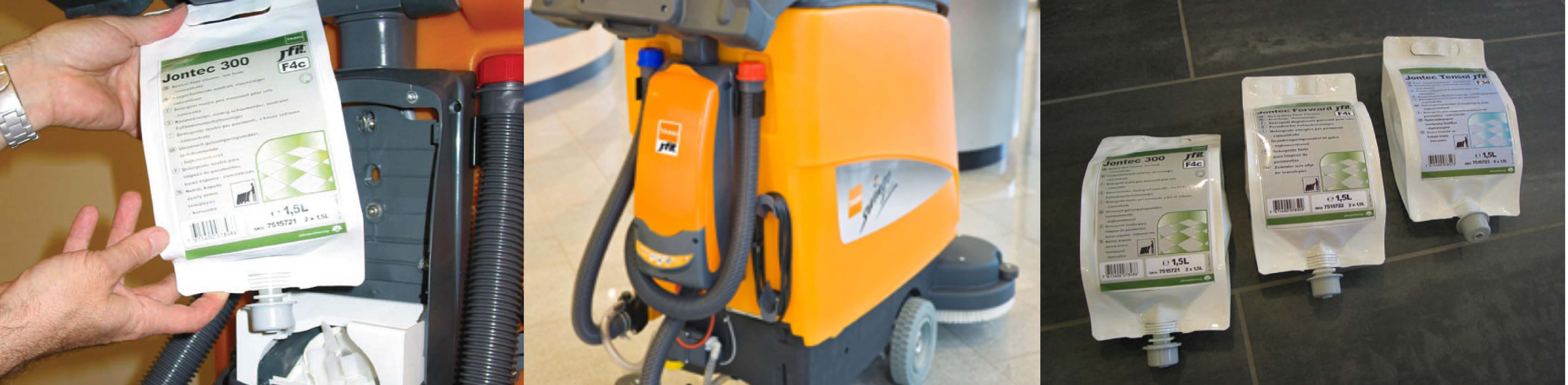 Los productos de limpieza TASKI utilizados en el sistema JFit incluyen un limpiador neutro para suelos (Jontec 300), un detergente enérgico para grasas y aceites minerales (Jontec Forward) y un limpiador con glioalcohol para suelos (Jontec Tensol). Gracias al uso de superconcentrados en envases compactos, no será necesario manipular, almacenar y transportar pesadas garrafas. El sistema también tiene un impacto positivo en el medio ambiente gracias a la reducción del 90% en residuos de envase. Dos envases de 1,5 litros equivalen al poder de limpieza de 3 garrafas de 5 litros de producto convencional. Su pequeño tamaño proporciona una manipulación más ergonómica y sencilla y menor espacio de almacenamiento.