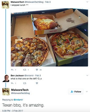 “Una hazaña como la que ha llevado a cabo Marcus Hutchins no debería pasar inadvertida. Cuando conocimos su pasión por la pizza, supimos que teníamos que intervenir y agradecer su gran trabajo con un pequeño gesto. En Just Eat hay miles de pizzas, así que Marcus tendrá muchas opciones para elegir mientras continúa con su lucha contra el delito cibernético”, afirma un portavoz de Just Eat.