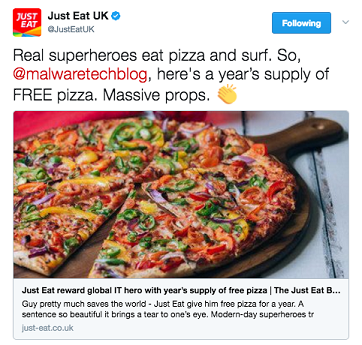 Marcus Hutchins, el informático autodidacta que inadvertidamente frustró la propagación del virus WannaCry, ha recibido un agradecimiento un tanto peculiar. Tras descubrir la pasión del joven por la pizza, la compañía líder en el mercado de comida a domicilio Just Eat le ha regalado un año de pizza gratis*.