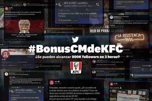 Su éxito entre los usuarios de Twitter no paraba de crecer y fueron muchos los que pidieron un ‘merecido aumento de sueldo’ para el Community Manager. Y la respuesta de la compañía no se hizo esperar. El pasado martes 20 de octubre a las 19:36 horas el ‘sr KFC’ se puso en contacto con el CM: ‘si llegamos a 200K seguidores hoy, te doy 5.000€’. En ese momento nace #BonusCMdeKFC, el hashtag con el que community manager pidió a los usuarios de Twitter su ayuda para lograr conseguir más de 75.000 nuevos seguidores antes de las 00:00 horas.