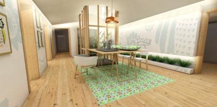 El estudio de interiorismo Egue y Seta ha sido el encargado de crear un espacio multifuncional, fresco y acogedor utilizando los diferentes patrones de los diseños de la gama Kleenex® Collection. Su estilo ha servido de inspiración para plasmarlo en diferentes texturas que se han utilizado como revestimiento en el suelo, telas, paredes, etc.