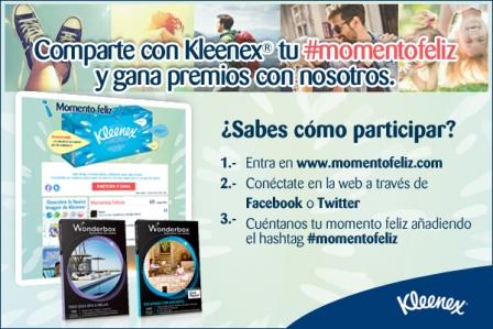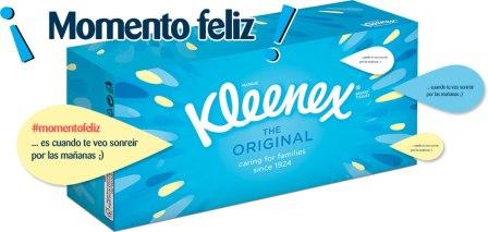 Tus momentos felices tienen premio con Kleenex®. La marca original de pañuelos de papel sortea un fin de semana de ensueño entre los que compartan estos instantes especiales que te hacen sentir bien. Para ello, ha creado el microsite www.momentofeliz.com en el que invita a sus consumidores a publicar sobre estas experiencias a través de distintas redes sociales (facebook y twitter) con el hashtag #momentofeliz.