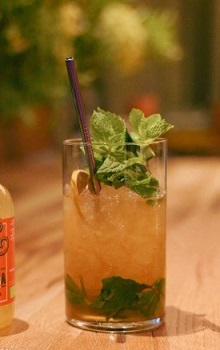 - En un vaso ponemos unas hojas de hierbabuena en el fondo, añadimos 2 cucharadas de panela, 40 ml de zumo de manzana, 30 ml de vermut blanco, 20 ml de zumo de lima y 100 ml de Komvida de manzana, canela y vainilla.