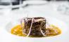 Lentejas estofadas con patata rellena de tuétano y morcilla
