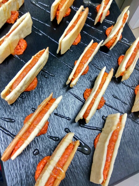 Macaron de bonito con tomate / Bocadillo de chorizo de León / Croqueta de camarones