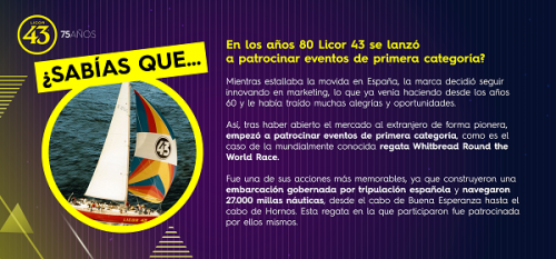 En comunión con su carácter innovador y su espíritu vanguardista, en los años 80 Licor 43 se aventuró a buscar una forma de conectar con el público diferente. Así, empezó a patrocinar eventos de primera categoría, como es el caso de la mundialmente conocida regata Whitbread Round the World Race.