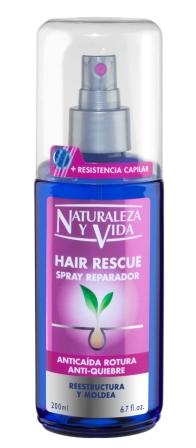 El nuevo Spray Anticaída Anti-Rotura Hair Rescue de Naturaleza y Vida es un revolucionario spray reparador sin aclarado que ayuda a reparar la fibra capilar y proteger las puntas, combatiendo la caída del cabello y previniendo su rotura. Facilita el peinado aportando brillo además de proteger el cabello de los daños que provoca el calor del secador. No ensucia ni apelmaza y permite a los cabellos rizados moldear el rizo, evitando su encrespamiento y a los cabellos lisos les aporta volumen, dejándolos sueltos. No contiene siliconas, colorantes, ftalatos, aceites minerales ni sulfatos.