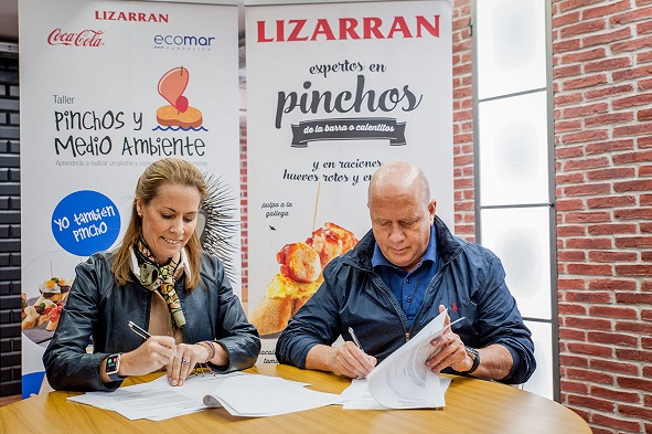 La ex regatista olímpica Theresa Zabell, Presidenta de la Fundación Ecomar, y el Presidente de Lizarran, Manuel Robledo, han rubricado recientemente el acuerdo en la sede de la enseña de pinchos.